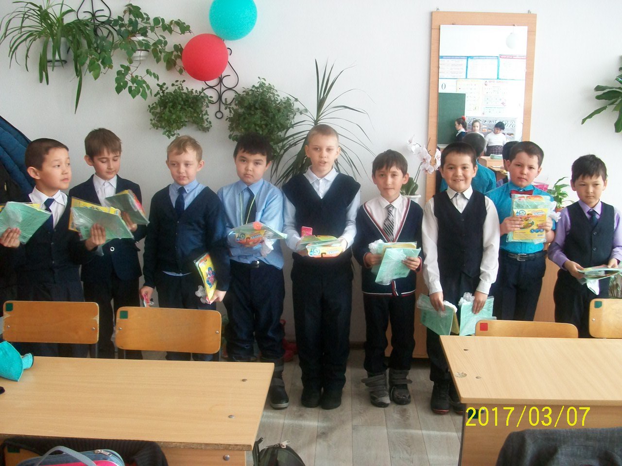 Мальчики поздравили девочек с 8 марта. Девочки с благодарностью приняли подарки. Особенно им понравились цветочки-ручки.